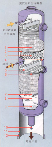 2、支撐柵板 3、液體收集器 4、集液環(huán) 5、多級槽式液體分布器 6、填料壓圈 7、支撐柵板 8、蒸汽入口管 9、塔底 10、至再沸器循環(huán)管 11、裙座 12、底座環(huán) 此結構適合于直徑大于等于800mm的填料塔。 |