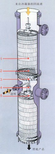 1、規(guī)整填料 2、支撐柵板 3、液體收集器 4、降液管 5、管式液體分布器 此結構適合于直徑小于800mm的填料塔。 |